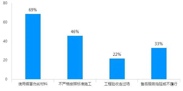 选择家装防水全包时,消费者最担心什么呢?选择家装防水全包时,消费者最担心什么呢?测评数据显示,消费者有4大担心,担心使用假冒伪劣,担心不按照标准施工,担心工程验收走过场,担心售后服务拖延或不履行。其中担心使用假冒伪劣的最多,占比达到69%。