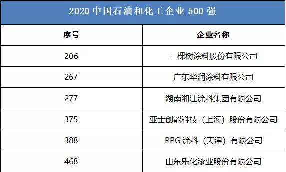 榜单显示,有6家涂料企业上榜2020中国石油和化工企业500强,分别是:三棵树涂料股份有限公司、广东华润涂料有限公司、湖南湘江涂料集团有限公司、亚士创能科技(上海)股份有限公司、PPG涂料(天津)有限公司、山东乐化漆业股份有限公司,分列第206、267、277、375、388、468位。