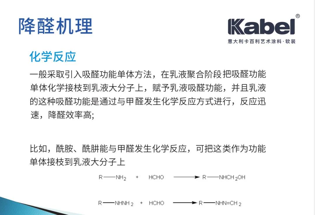 作为艺术涂料的头部品牌,卡百利专注于产品研发与应用。为了解决大众所关心的装修中极易发生甲醛污染问题痛点,创新自主研发降解甲醛技术,在乳液聚合阶段把吸醛功能单体化学接枝到乳液大分子上,赋予乳液吸醛功能,并且乳液的这种吸醛功能是通过与甲醛发生化学反应方式进行,反应迅速,降醛效率高,该项降解甲醛技术已在2019年获得国家发明专利。