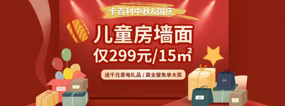 卡百利开启“中秋国庆双节促销活动”-儿童房墙面仅299元/15O全国性终端活动,可以点击上方图片识别小程序进入活动页面登记好个人信息,线上预约量房免费送护眼灯,千元家电礼品、全屋免单大奖还有多重好礼等着你哦!