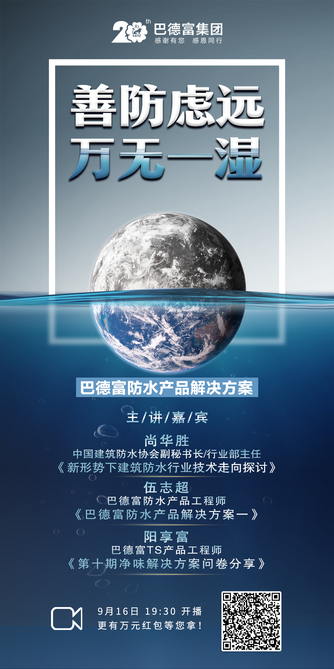 9月16日晚,巴德富“感谢有您 感恩同行”20周年献礼系列——巴德富防水产品解决方案专题讲座成功举行。这场直播是以“善防虑远 万无一湿”为主题,探究防水行业谜题。