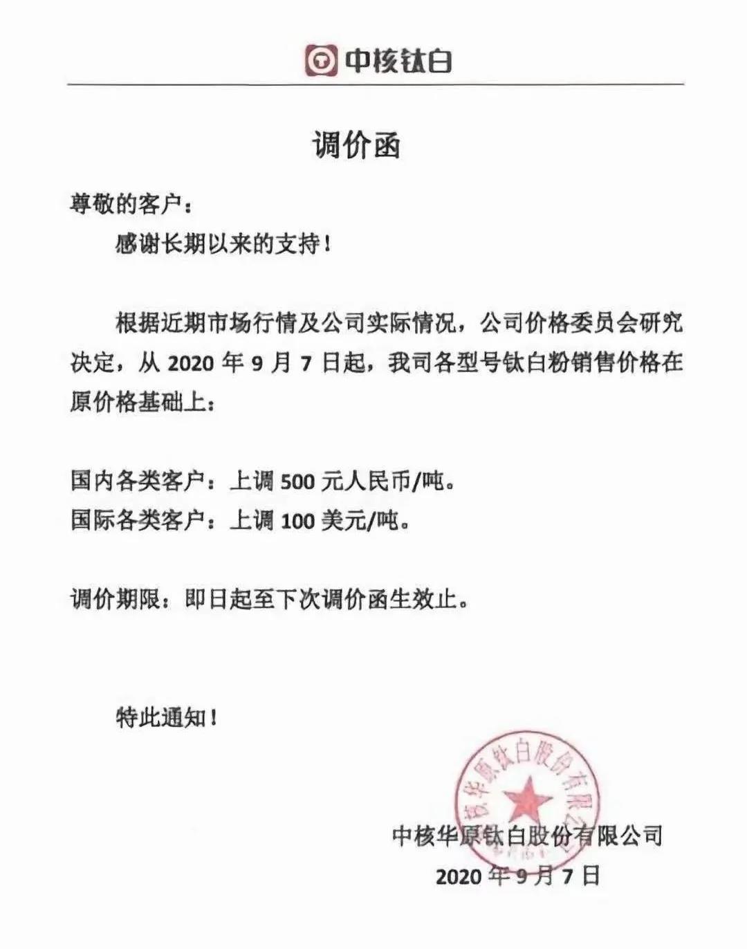 除了中核钛白宣布钛白粉产品提价之外,龙蟒佰利联也表示,自9月7日起,公司各型号钛白粉(包括硫酸法钛白粉、氯化法钛白粉)销售价格在原价基础上对国内客户上调500元人民币/吨,对国际各类客户上调100美元/吨。