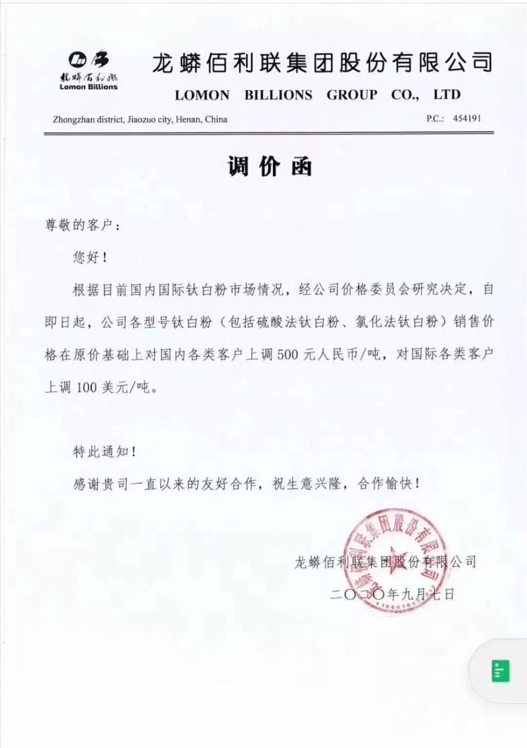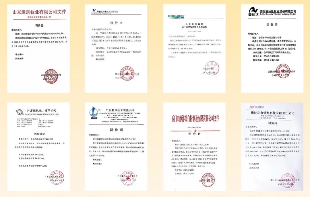 然后,山东道恩钛业有限公司、攀枝花恒通钛业有限公司、山东东佳集团、安徽安纳达钛业股份有限公司等也纷纷发出了调价函,对国内客户平均上调500元人民币/吨,对国际各类客户上调80~100美元/吨。