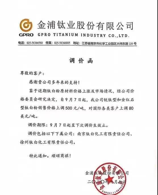 此外,《涂料经》还了解到,金浦钛业也自9月7日起,公司锐钛型和金红石型钛白粉销售价格上调500元人民币/吨,对国际各类客户上调80美元/吨。