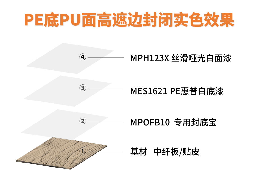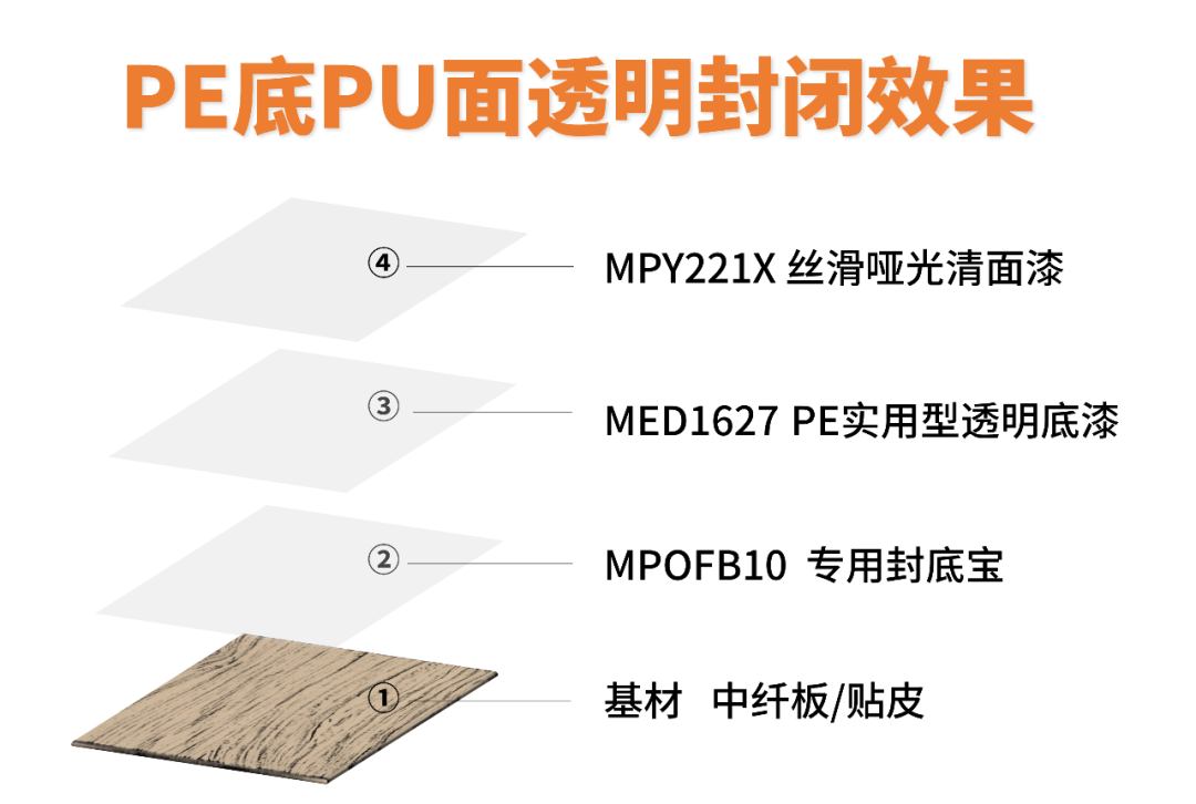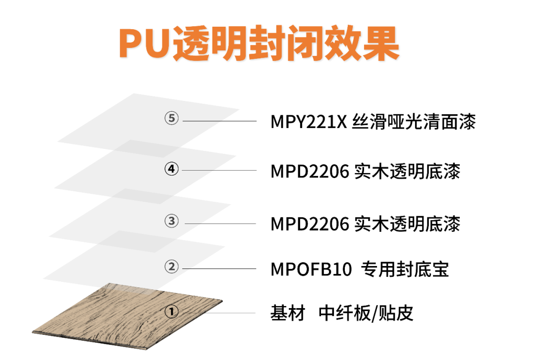 该涂装工艺选用MPD2206实木透明底漆,高温高湿度情况下防气泡性能突出,特别适用于深木眼类基材的涂装,打磨后无白点。