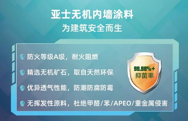 该产品在满足国家防火标准上,特别增添防霉抗菌功能,解决了公共空间霉菌滋生的问题;A级防火+防霉抗菌+健康环保三管齐下,亚士无机内墙涂料能有效满足用户全场景涂装的需求。