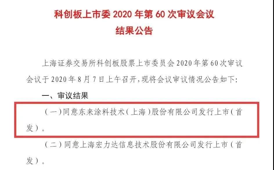 8月7日,东来涂料技术(上海)股份有限公司(以下简称“ 东来股份”)首发申请获上交所上市委员会通过,将于上交所科创板上市。