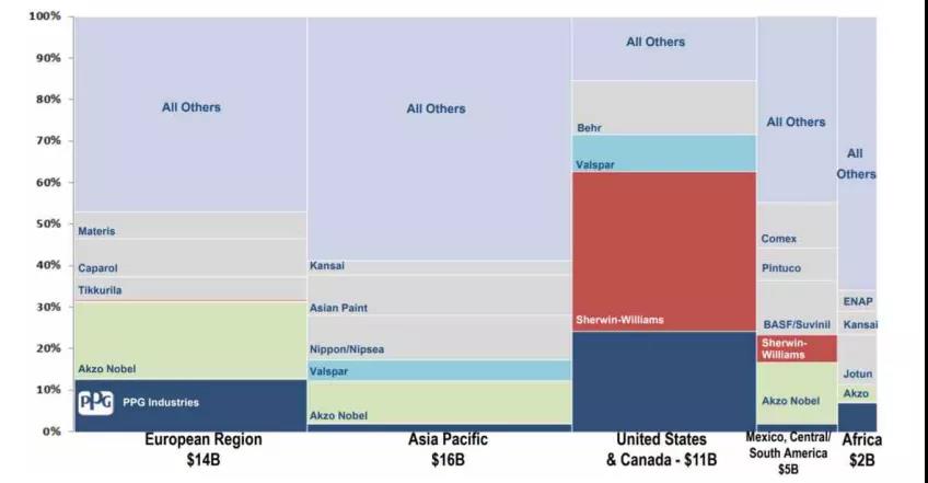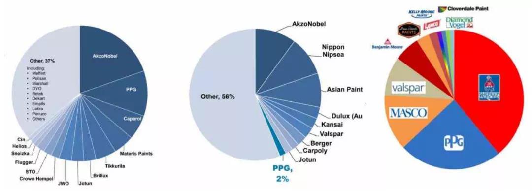 从左起分别为:欧洲建筑涂料市场集中度、亚太建筑涂料市场集中度、美国&加拿大市场集中度