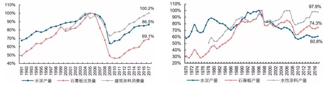 在地产逐步回暖但中枢已经大幅下降的背景下,建筑涂料表现显著好于水泥与石膏板。美国2017年水泥、石膏板产量/出货量仅为峰值的86.5%、69.1%,而建筑涂料消费量已经与此前峰值持平;日本2017年水性涂料产量达到峰值的97.9%,而同期水泥、石膏板产量分别仅为峰值的60.8%、74.3%。