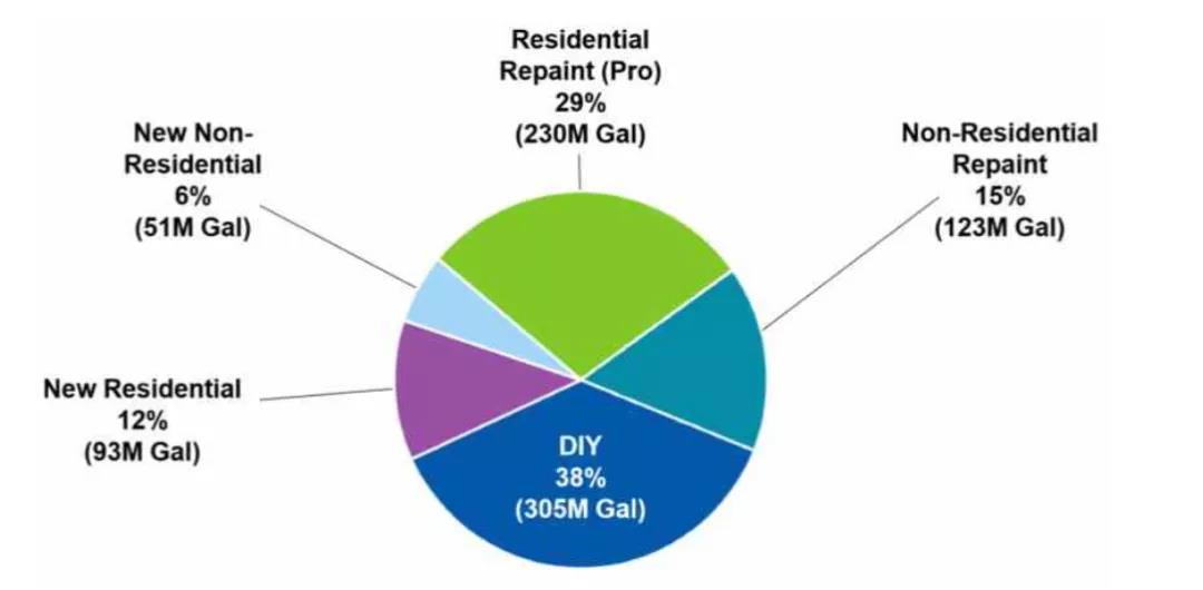 建筑涂料需求韧性更好,主要是因为系重涂对需求形成有力支撑,尤其是对自有住宅的改造和提升中的重涂对行业增长贡献较大。美国建筑涂料行业中重涂占比较高。在美国建筑涂料市场中,重涂占比约为44%,新房涂刷占比约18%,剩余的38%为消费DIY,考虑到消费者DIY 中也有较高占比为重涂,因此建筑涂料市场中重涂占据主要份额。
