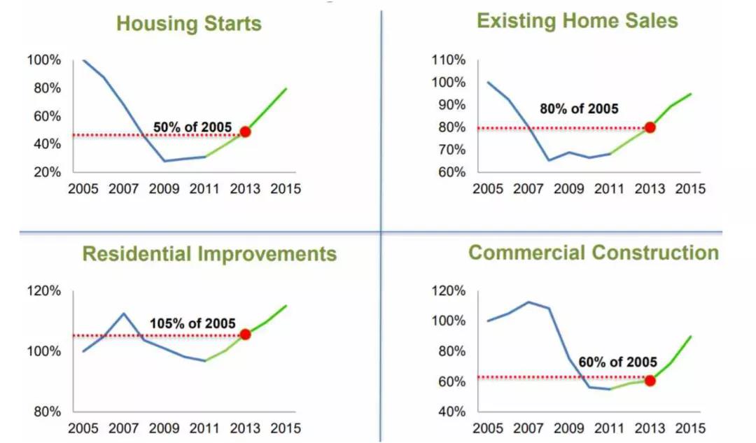 此图由PPG 发布,表示2005年-2013年期间,美国各领域建筑涂料需求量相对2005年的变化情况,其中2005年为基准值100%。暗绿色表示2011年开始建筑涂料需求整体复苏,亮绿色为预测值。