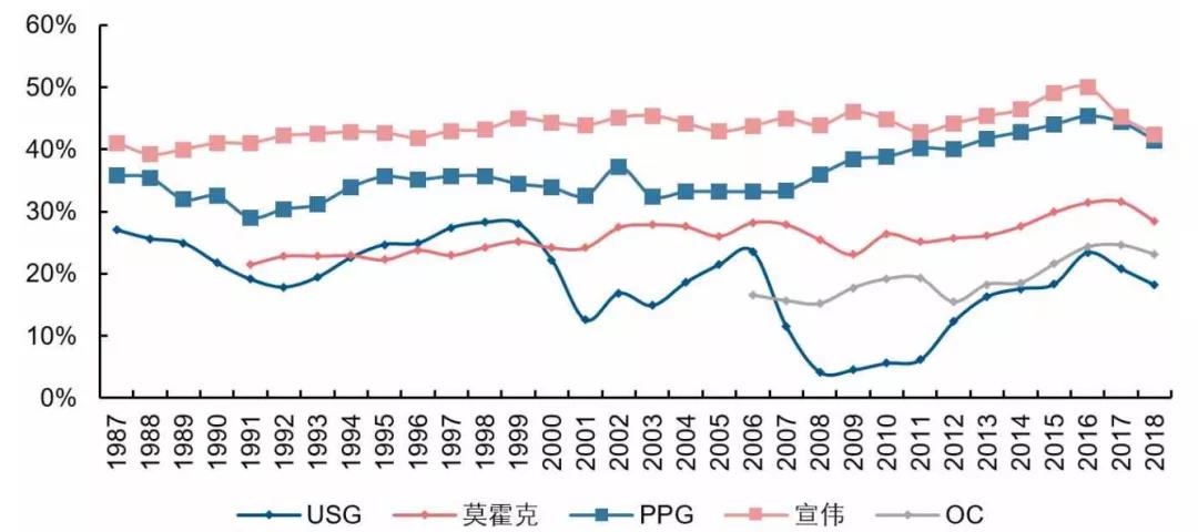 主要建材类美股毛利率对比,涂料企业毛利率明显领先其他企业