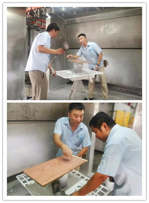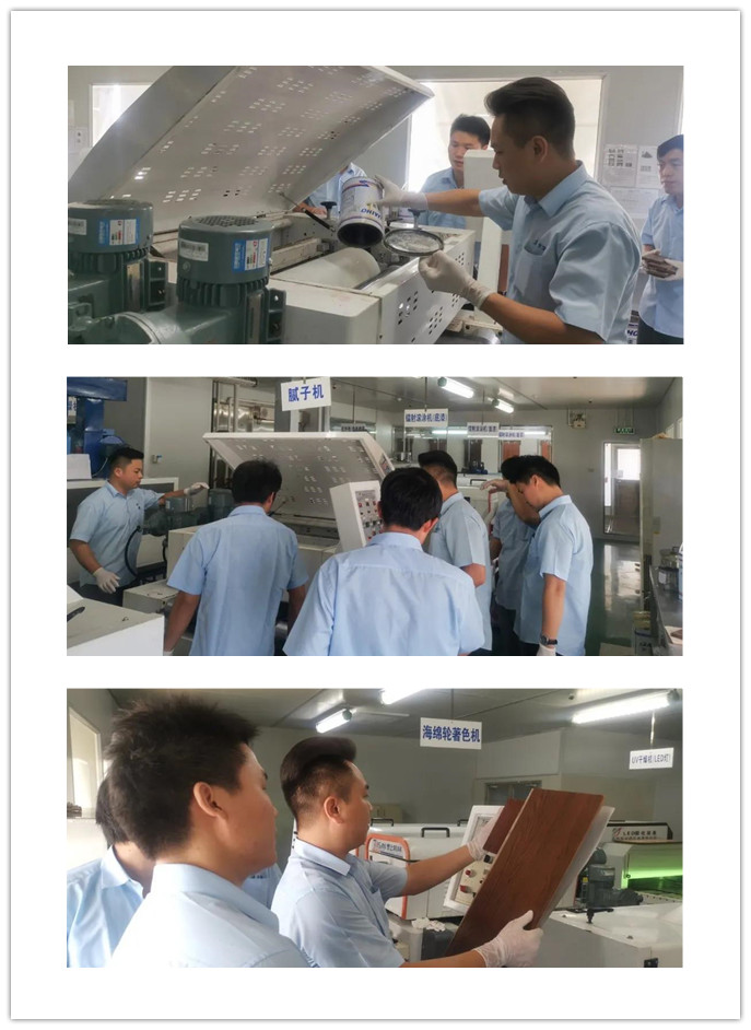 在UV漆产品知识及涂装操作方面,工程部UV漆专案副理张凯铭和学校讲师为参训人员讲解环保涂料UV漆产品知识、UV设备操作、注意事项等内容。UV专案资深工程师敬洪江指导学员操作UV漆设备、UV色板制作。