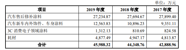 其中,汽车售后修补涂料2017-2019年销售收入分别为2.29亿元、2.77亿元、2.72亿元;汽车新车内外饰件、车身涂料分别为9351万元、1.09亿元、1.3亿元;3C 消费电子领域涂料为825万元、811万元、1312万元。