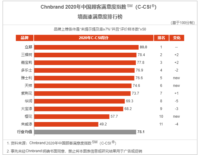 7月15日,品牌评级权威机构Chnbrand发布2020年(第六届)中国顾客满意度指数SM (C-CSI)品牌排名和分析报告,其中包含两项涂料产品品牌指数榜单——“墙面漆满意度排行榜”和“木器漆(油漆)满意度排行榜”。