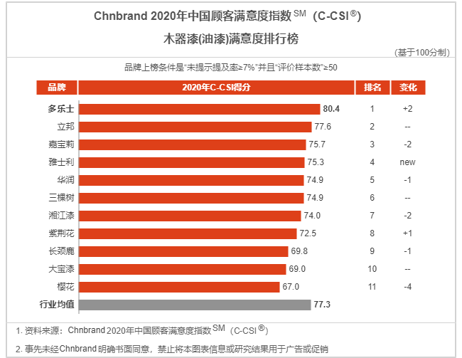 而“木器漆(油漆)满意度排行榜”中,多乐士的排名跃升至第一的位置,压过来去年处于榜首的嘉宝莉和排名第二的立邦;立邦继续保持在第二的位置,嘉宝莉跌至第三。(具体榜单见下图)