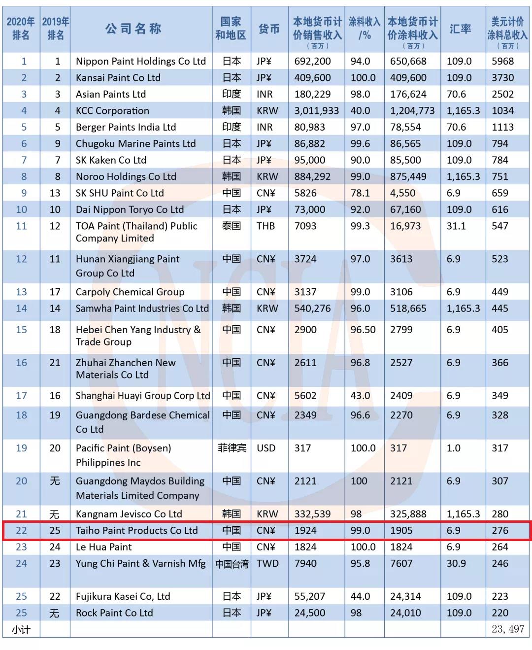 亚太地区涂料企业排行榜是由《亚太涂料杂志》每年颁布一次,今年是该杂志第十二年对亚太地区涂料企业进行评比。其作为全球唯一涵盖亚太涂料市场的双月刊,专门报道亚太地区(由印度至澳大利亚)的涂料行业资讯,是全球化工业界高层普遍公认的涂料行业权威的刊物之一。