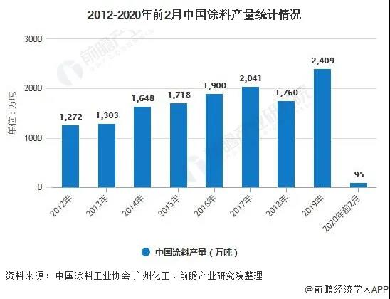 2019年全国涂料销售量为2416万吨,产量为2409万吨。2020年1-2月,中国涂料产量为95万吨左右,同比大幅下降,受新冠状病毒肺炎疫情持续影响之下,工厂开工率受到严重影响,上下游市场需求明显受压。