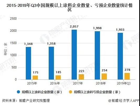2018年,中国规上涂料企业数量为1998家,较上年减少59家;2019年第三季度,行业规上企业数量下降至1933家。