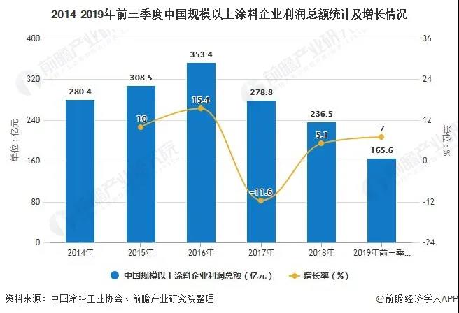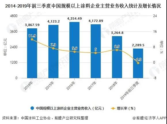 2019年前三季度,中国涂料行业规上企业主营业务营收2289.5亿元,同比小幅下降0.3%。