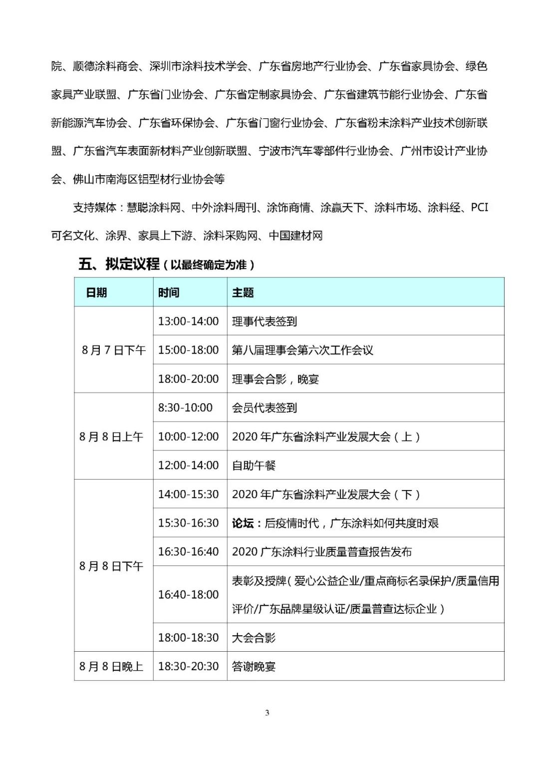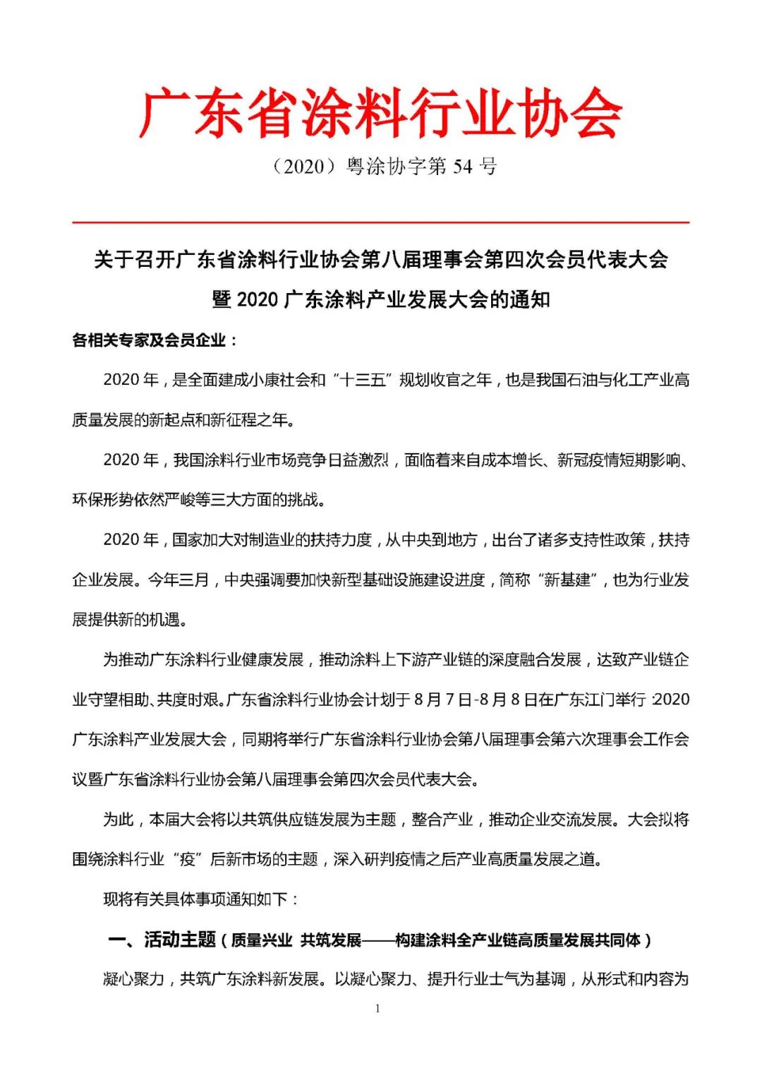 为推动广东涂料行业健康发展,推动涂料上下游产业链的深度融合发展,达致产业链企业守望相助、共度时艰。广东省涂料行业协会计划于8月7日-8月8日在广东江门举行:2020广东涂料产业发展大会,同期将举行广东省涂料行业协会第八届理事会第六次理事会工作会议暨广东省涂料行业协会第八届理事会第四次会员代表大会。