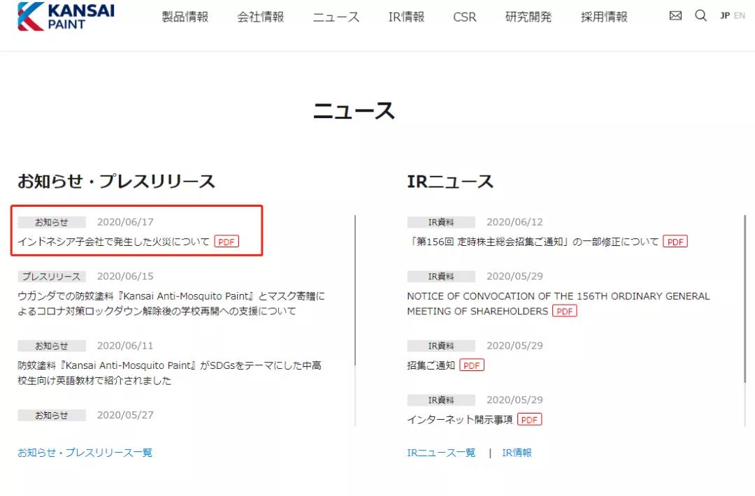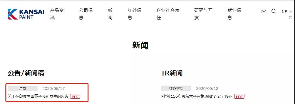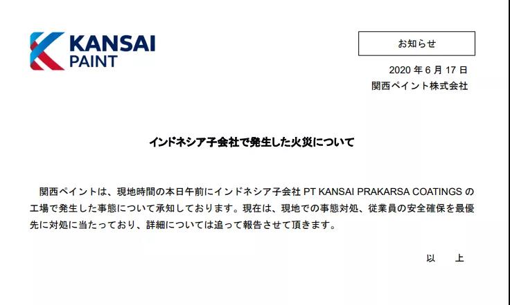 6月17日,关西涂料株式会社(Kansai Paint,以下简称“关西涂料”)发布公告称:当地时间今天(17日)上午在印度尼西亚子公司PT KANSAI PRAKARSA COATINGS的工厂发生火灾。目前,我们正在处理当地情况,并确保将员工的安全放在首位,我们将在稍后报告详细信息。