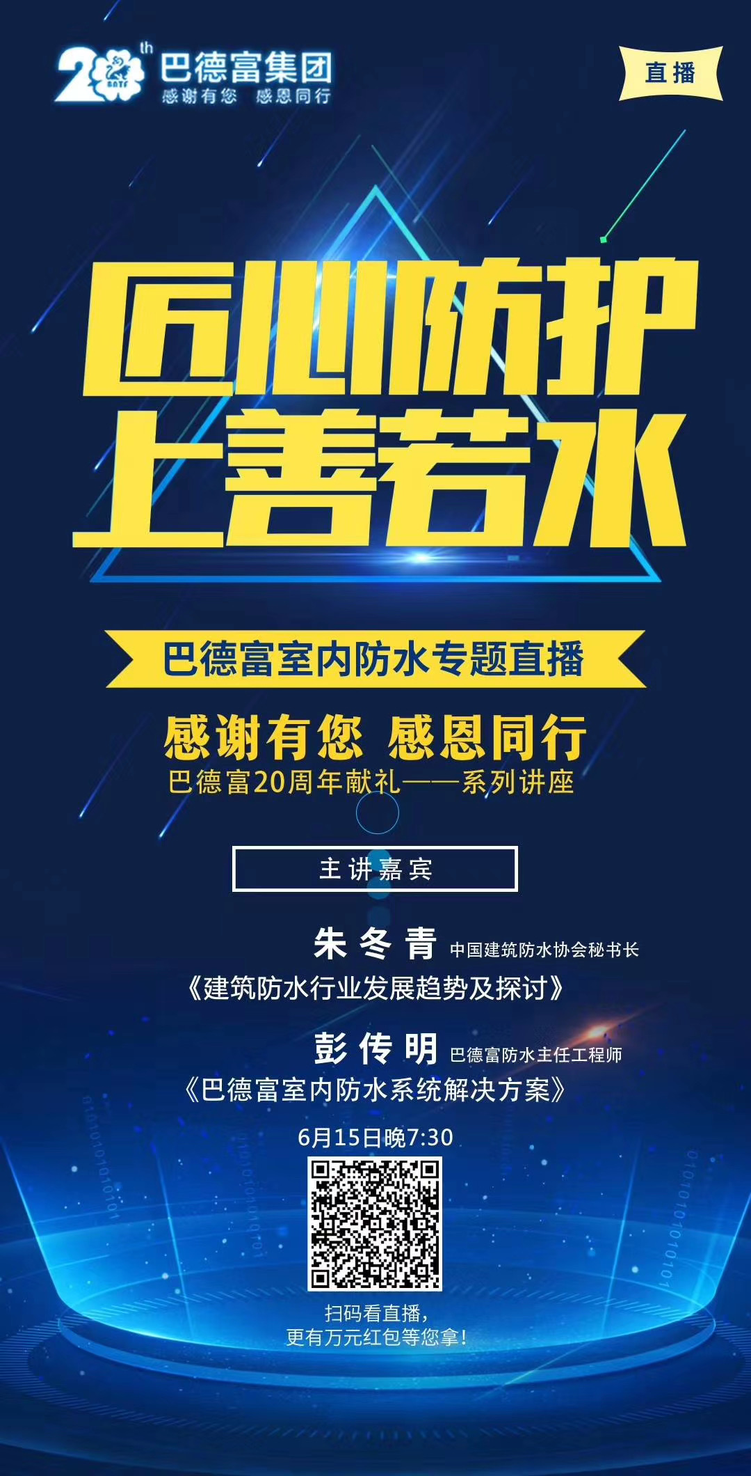 6月15日晚,巴德富“感谢有您 感恩同行”20周年献礼系列——巴德富室内防水专题讲座成功举行。这场直播是以“匠心防护,上善若水”为主题,探究防水行业谜题。