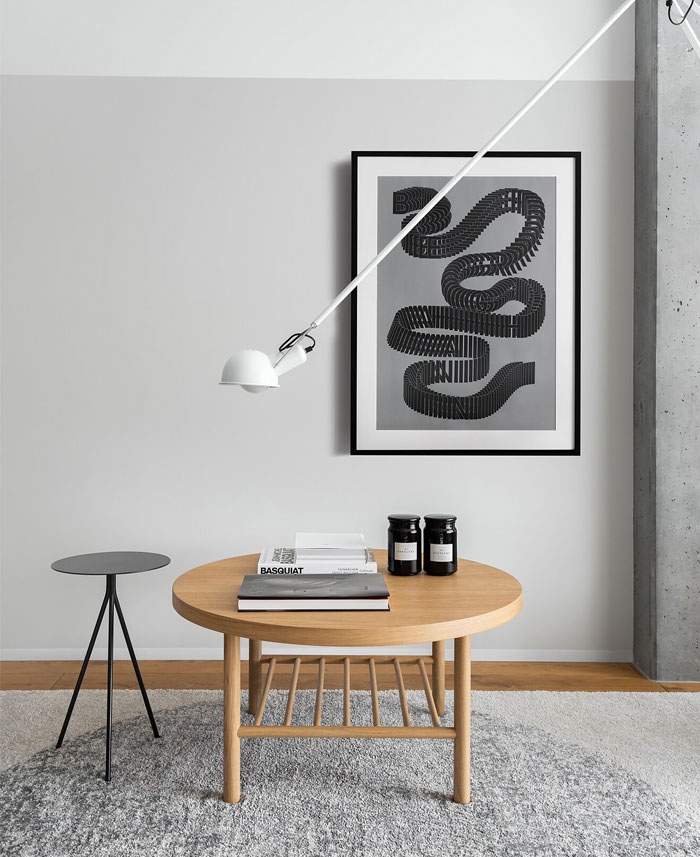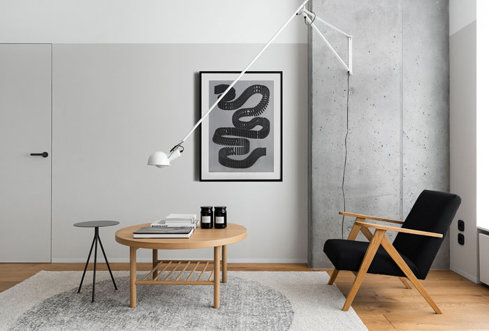 在整体色调上都以灰色为主,通过不同饱和度的灰来装饰,配以木色的家具,使得整个空间不会显得暗淡。加之灯具、装饰画与细腿单人凳的线条简单直接,极具现代感。