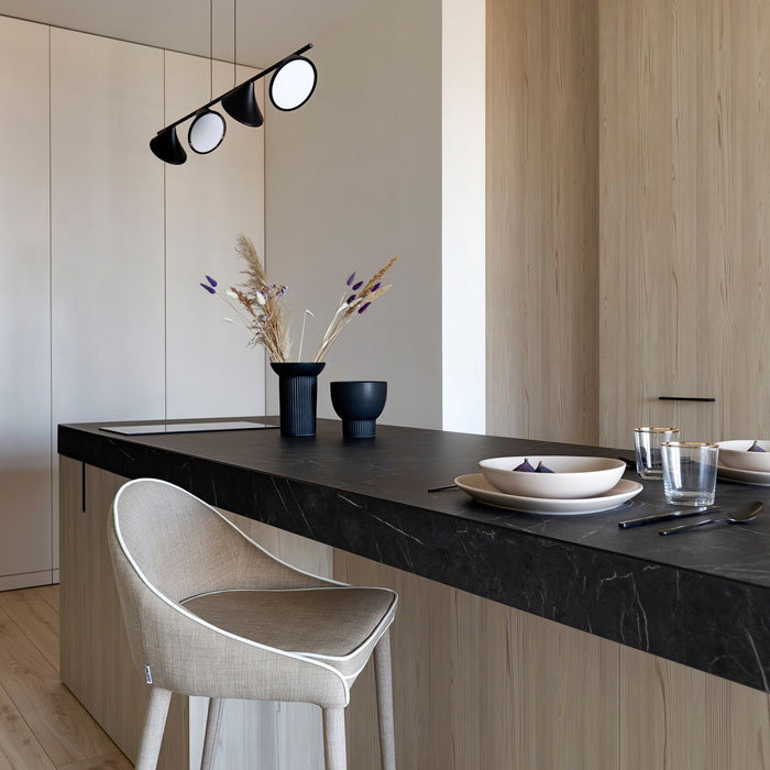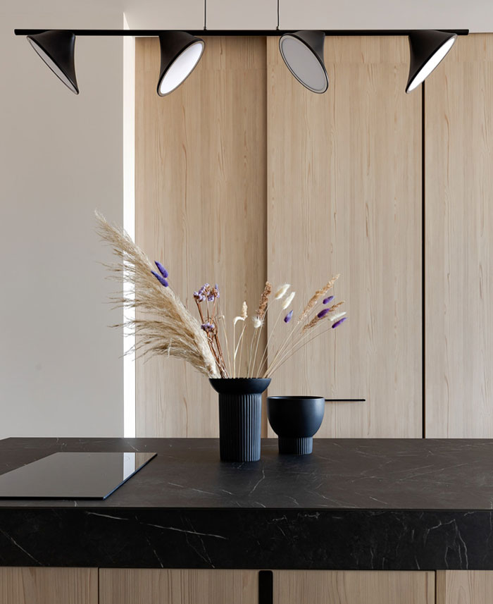 采用原木色基调,搭配黑色带有白色筋络的大理石,融合黑白的经典,营造出一种时尚端庄的高品质与档次感。