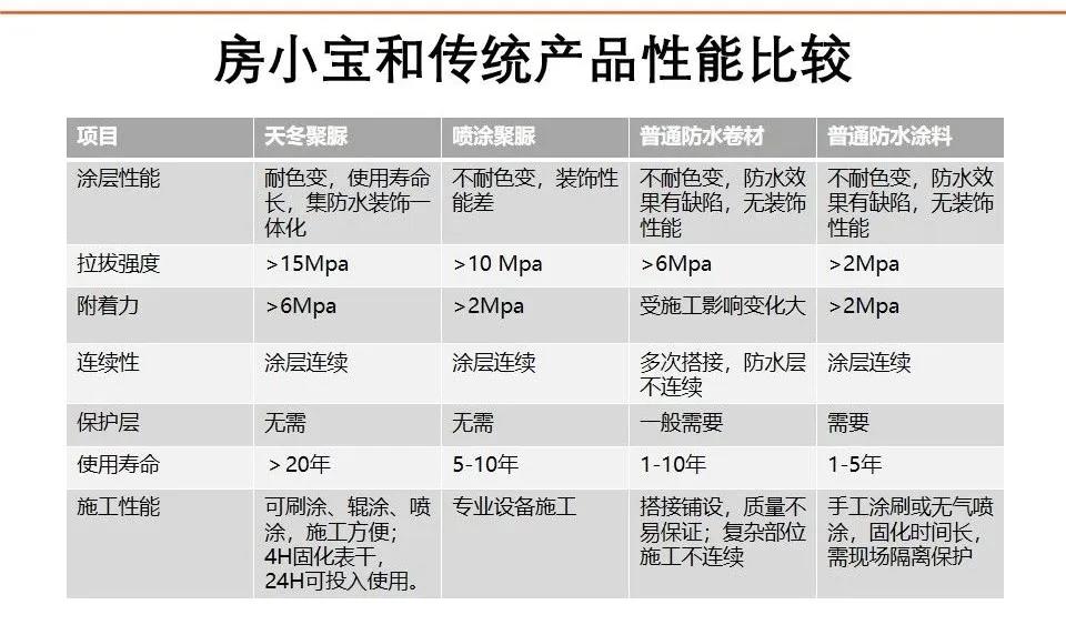 由于使用了天冬聚脲技术,使得房小宝的产品在涂层性能、拉拔强度、附着力、使用寿命、施工性能等方面拥有诸多优势——与传统的防水产品相比要么处于绝对领先的地位,要么就是具备同类型产品所不具备的特性——比如拉拔强度,如果是普通的防水涂料和防水卷材,一般只大于6兆帕,哪怕是喷涂聚脲也只是大于10兆帕,而天冬聚脲产品则可以大于15兆帕;再比如使用寿命,普通防水产品及喷涂聚脲产品都不会超过10年,天冬聚脲产品则可以达到超过20年的使用年限。