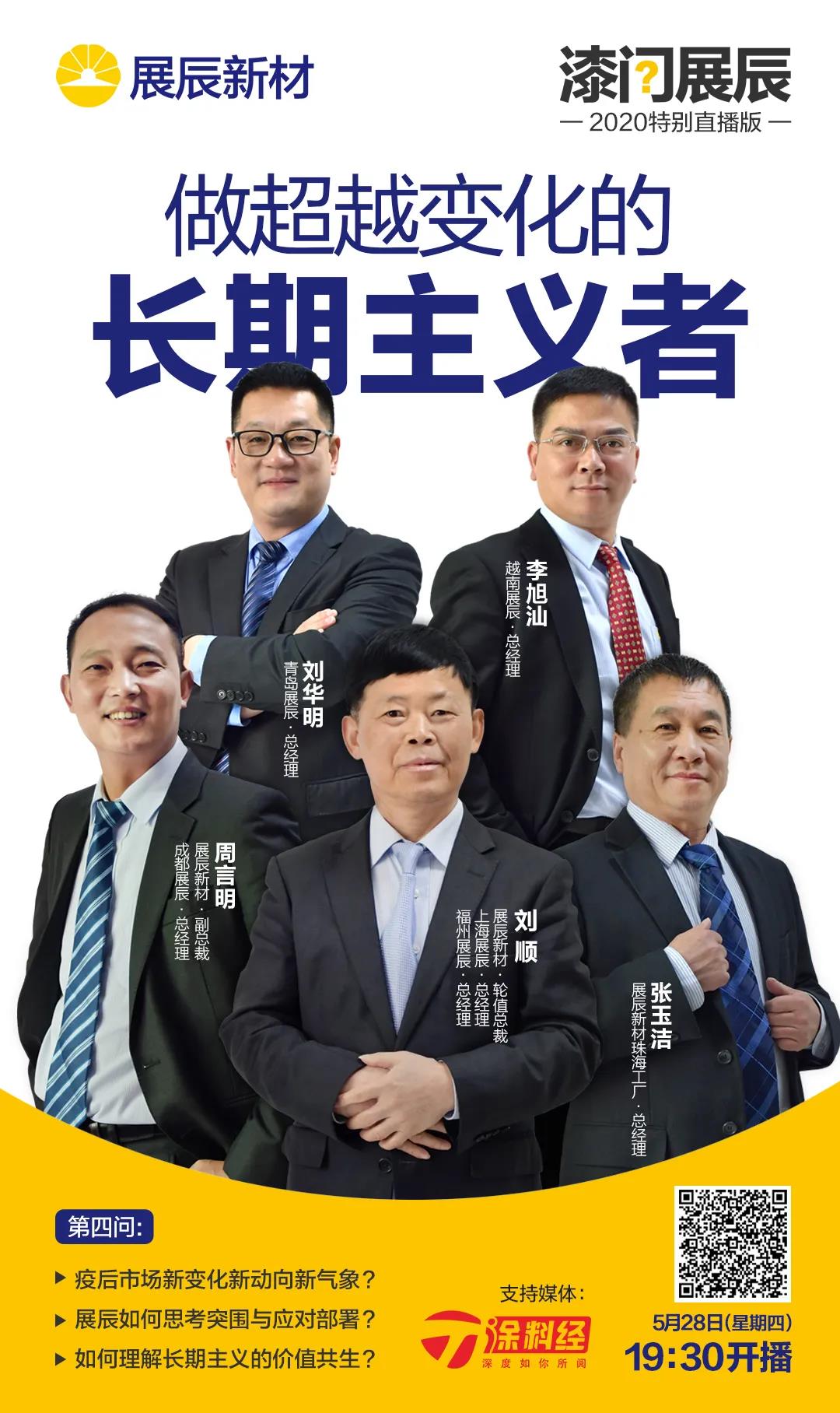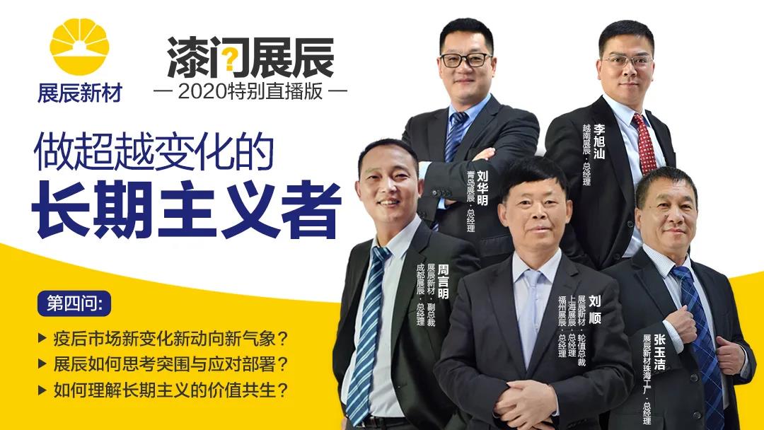 在直播当中,五位嘉宾围绕各自观察与所见的疫后市场的新变化、新动向、新气象进行讲述,并从各自所在的位置、以自身经验详细展示展辰新材如何思考、突围与应对部署,最终共同解释了展辰新材“长期主义”的价值观的真切含义。