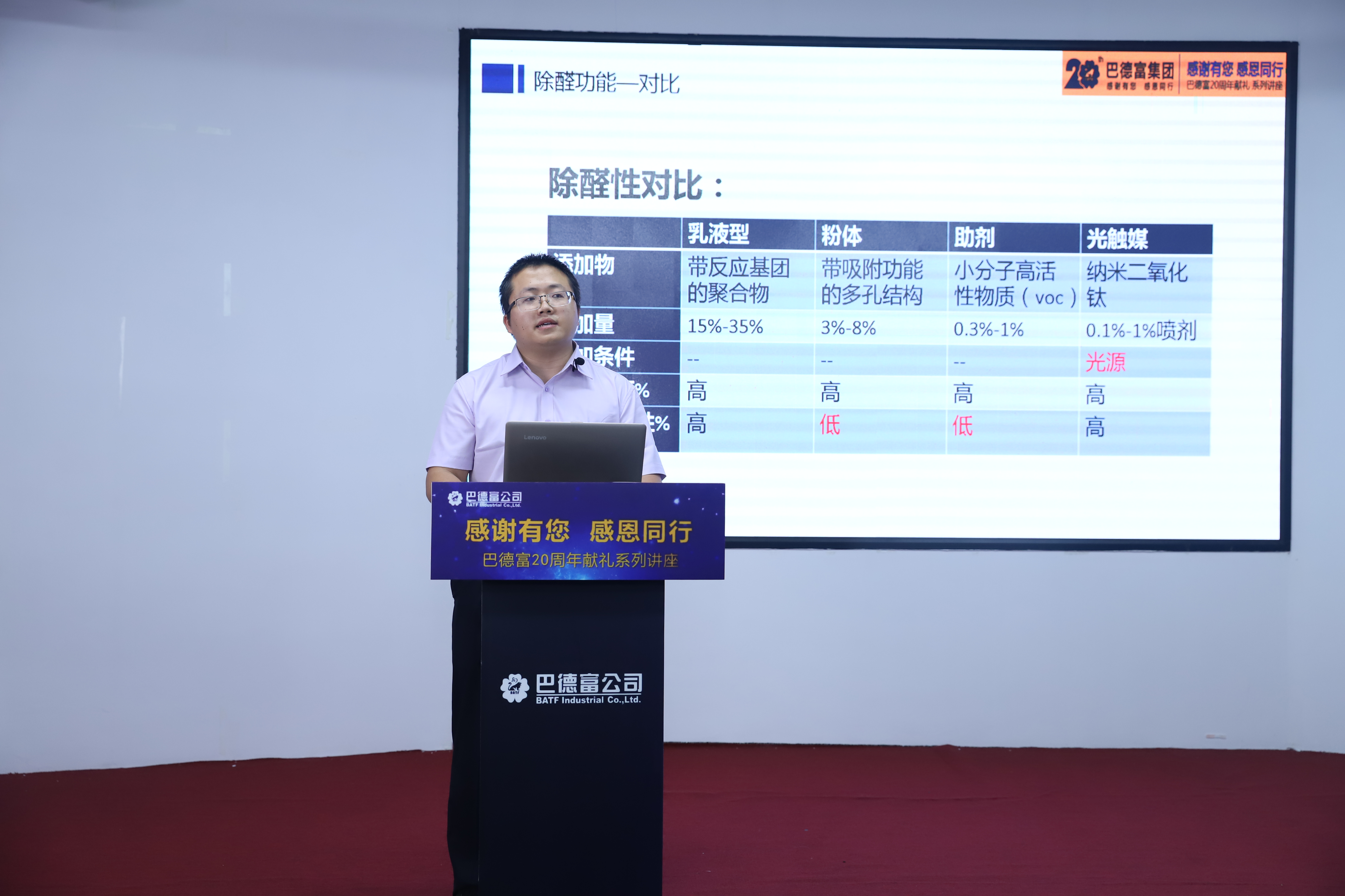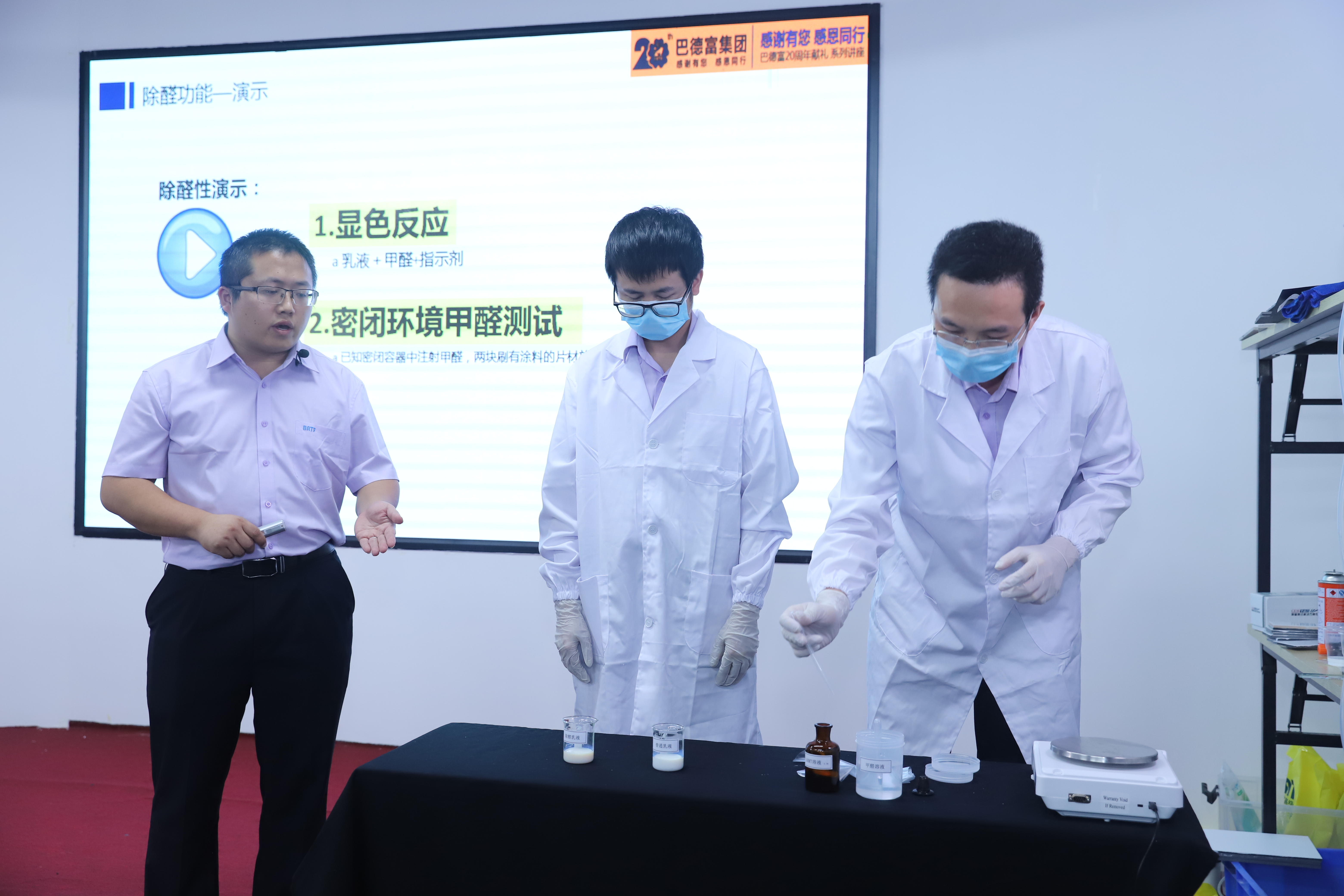 本场直播还有另外一位嘉宾、巴德富集团研发体系TS主任工程师余勇则站在自己专业的领域为观众解说巴德富《功能型涂料应用解决方案》。直播中,余勇对巴德富功能系列产品进行展示,向观众展示功能型产品的设计思路,并邀请专业人员对部分功能产品进行了演示。