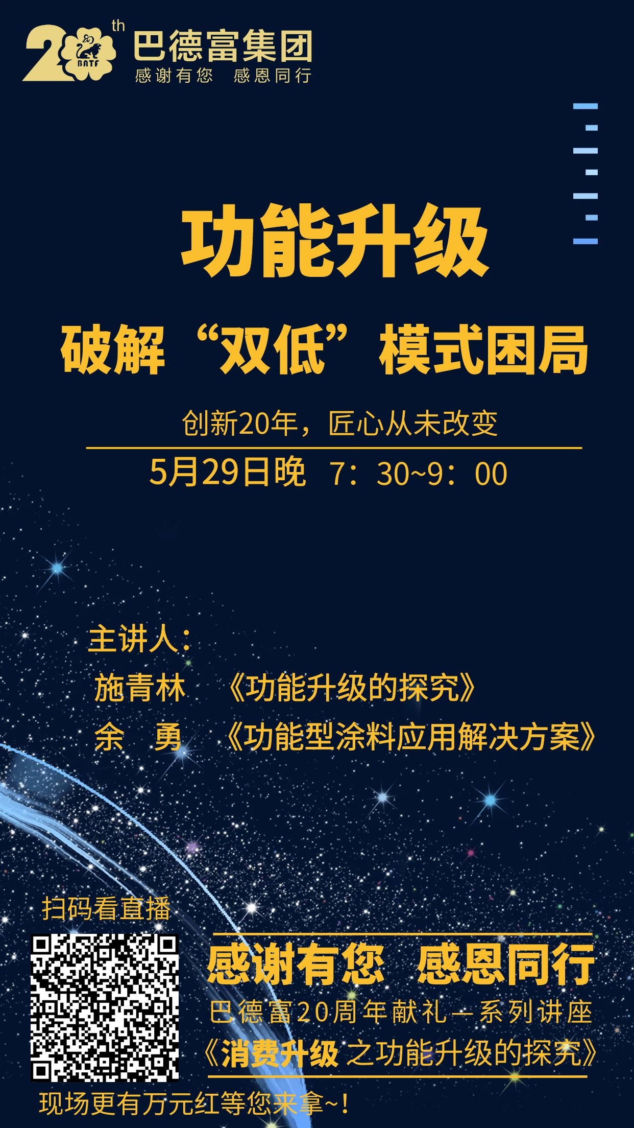 5月29日晚,巴德富“感谢有您 感恩同行”20周年献礼系列讲座第四场成功举行。这场直播是以“消费升级之功能升级”为主题,探究推动涂料人共同破解“双低”模式困局。