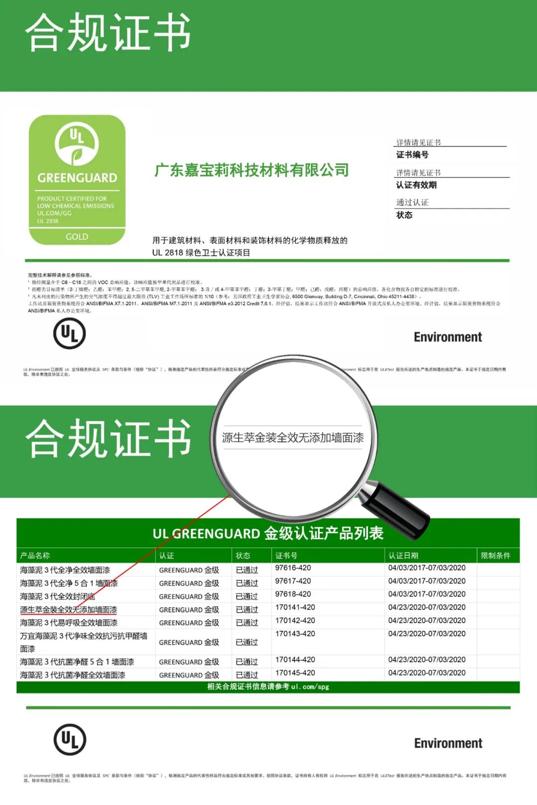 嘉宝莉源生萃金装全效无添加墙面漆不仅荣获美国GREENGUARD绿色卫士金级双认证、法国室内空气环境A+检测认证、而且满足低释放标准室内空气A+标准,还符合EN71-3欧盟玩具安全标准,以高级别的环保认证,为产品背书。据了解,美国UL GREENGUARD 认证分成两个级别。