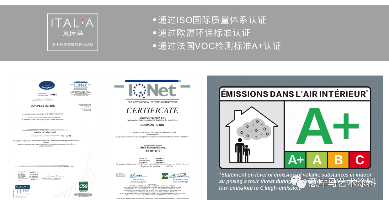 Giovnni Leone:有两个点是值得一提的,第一,DURIPLASTIC(杜利普雷斯特)公司的产品全面通过法国VOC检查A+认证,同时获得欧盟ISO认证。ITALIA意库马是以原装原罐进口的身份来到中国的, 100%原装出口,不进行二次分装,原厂生产,始终保持统一的高品质。第二,我们挑选了14款被视为市场现存完整度最高,被奉为经典的,最吸引人的装修系列产品带给中国的用户,它们当中有锈蚀效果、大理石条纹效果、金属质感效果、丝绸效果、星辰效果、罗马石灰效果、生态效果等等。第三,新产品量子灰系列的创新思维,以色彩作为依托,采用“智能分光技术”,打造不同的质感效果,来满足不同业主的需求,这是艺术涂料行业的一次勇敢的创新尝试。