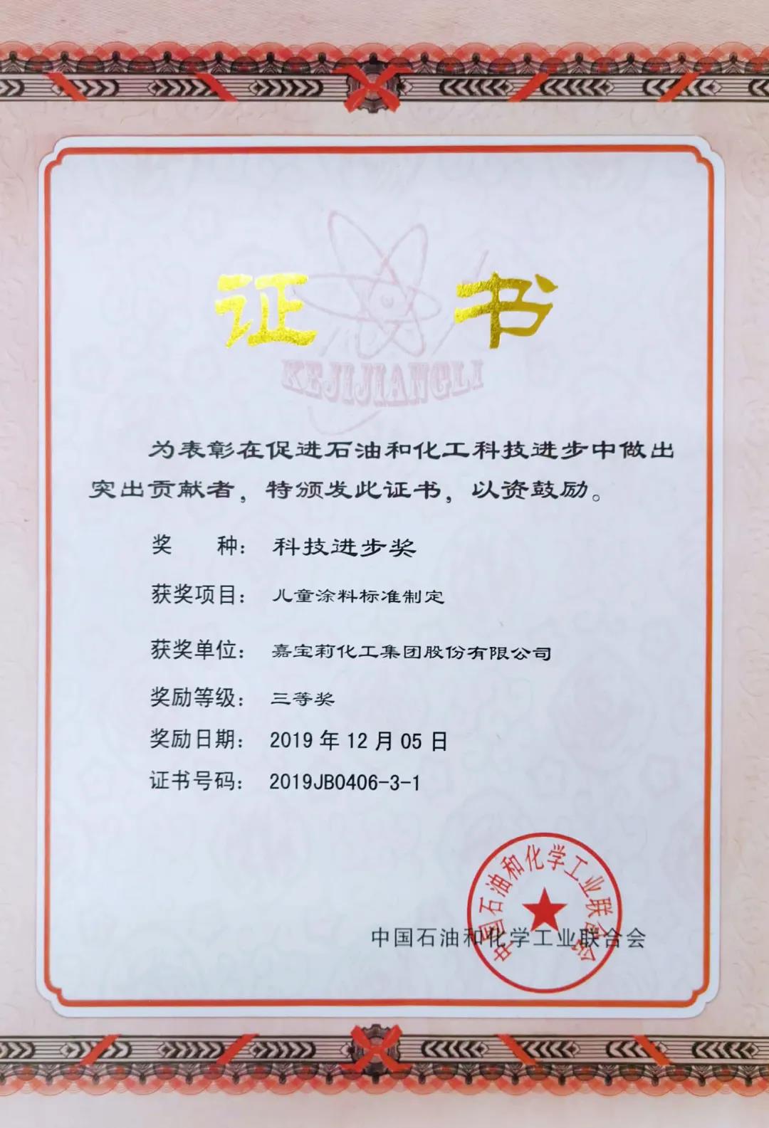 ▲儿童涂料标准制定项目荣获2019年科技进步奖