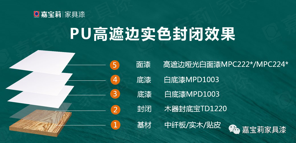 嘉宝莉PU高遮边涂装解决方案就是专为以上问题开发设计。底漆选用遮盖力和流平性兼具的 MPD1003 ,面漆可选用高遮边哑光白面漆 MPC222*或MPC224* ,遮黑边性能出色,流平性好,开稀比例高于同类产品。整套工艺不仅能轻松搞定黑边问题,解决木门涂装上的露底烦恼,而且在性价比上富有竞争力。