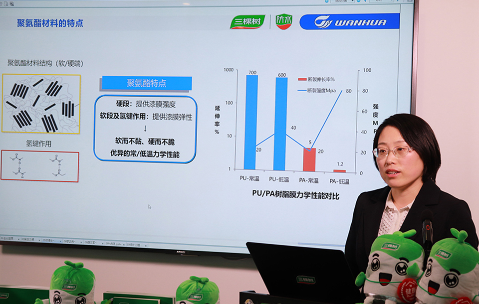 在本次发布会上,三棵树防水联合万华化学首家发布绿意清味水性超耐久聚氨酯防水涂料,重新定义聚氨酯涂料的环保性,开启了水性聚氨酯涂料“清味、健康、环保”的时代,引领防水涂料行业全面“油改水”。万华化学集团表面材料事业部副总经理邓俊英博士就水性聚氨酯防水涂料的技术难点及突破作了解答,三棵树防水产品总监蔡正伟博士对产品做了详细介绍。