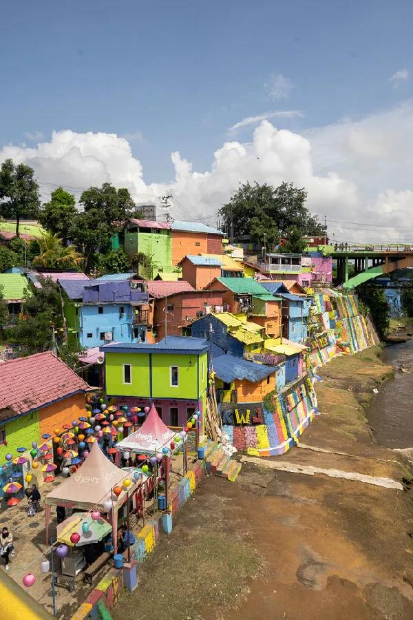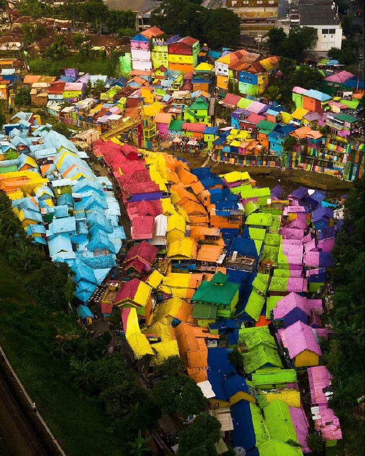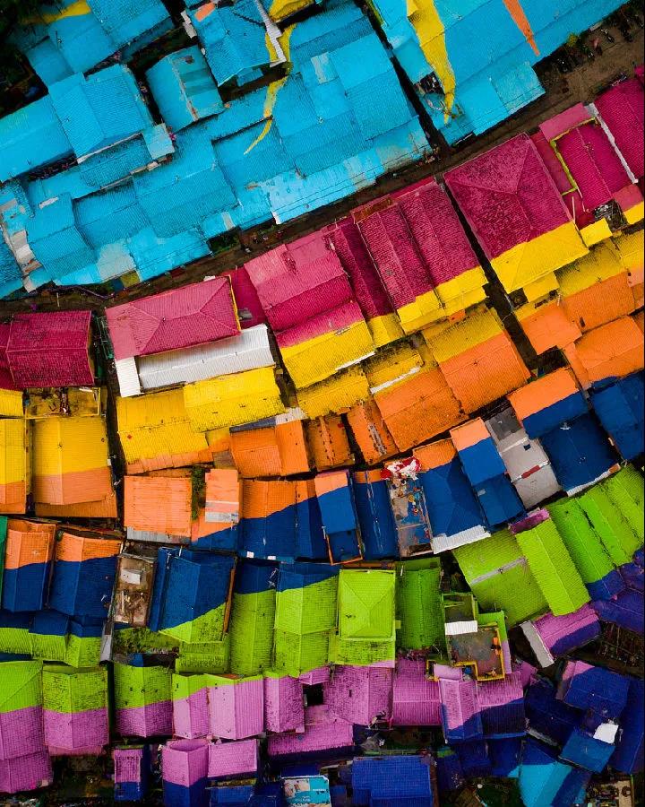 印度尼西亚东爪哇Jodipan,一个小村落被涂上鲜艳的颜色,立马变成了一道漂亮的彩虹风景线。一群大学生决定在当地贫民窟的建筑上喷涂彩色涂料,以帮助改善当地的生活水平,促进旅游业。在当地驻军的帮助,他们粉刷了整个村落。消防员、兼职无人机操纵员Hugo Healy到当地旅行时拍摄到这些照片。