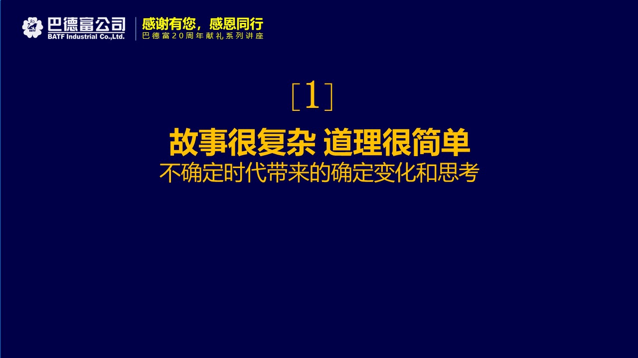 施青林表示,现今世界错综复杂,只有坚持本应专注的事才能够拨开层层迷雾,在不确定的环境找到确定的答案。“思考什么很重要,做什么却更重要”,要懂得“洞察、布局、聚力、践行、坚忍”。