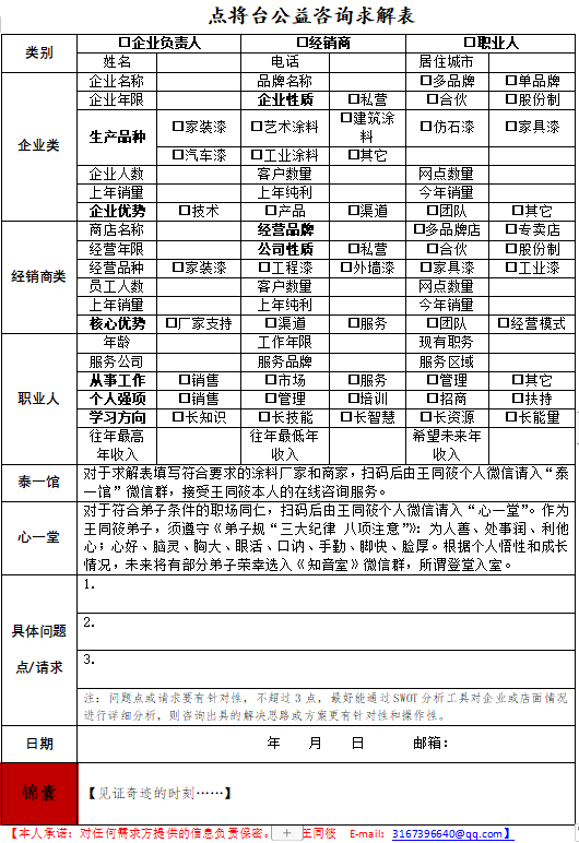 无论是寻求免费咨询或者希望成为王同筱弟子,有意向者均可扫码加入点将台公益咨询微信群后上传《点将台公益咨询求解表》报名。