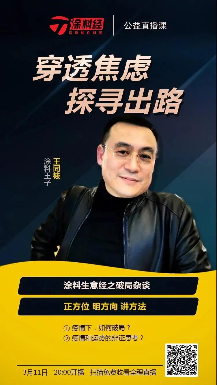 昨日,《涂料经》微信公众号发表了一篇王同筱署名文章。王同筱在文章中指出,为帮助涂料行业的厂家和经销商度过当前因受新冠肺炎疫情影响而导致的难关,他将免费为100家中小涂料企业和经销商提供公益咨询服务。
