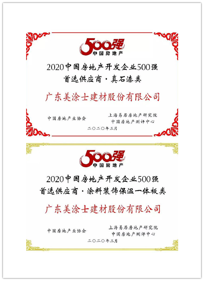 2020年3月18日,房地产开发企业500强首选品牌发布评选结果,美涂士连续6年蝉联中国房地产开发企业500强建筑涂料首选供应商五项殊荣!