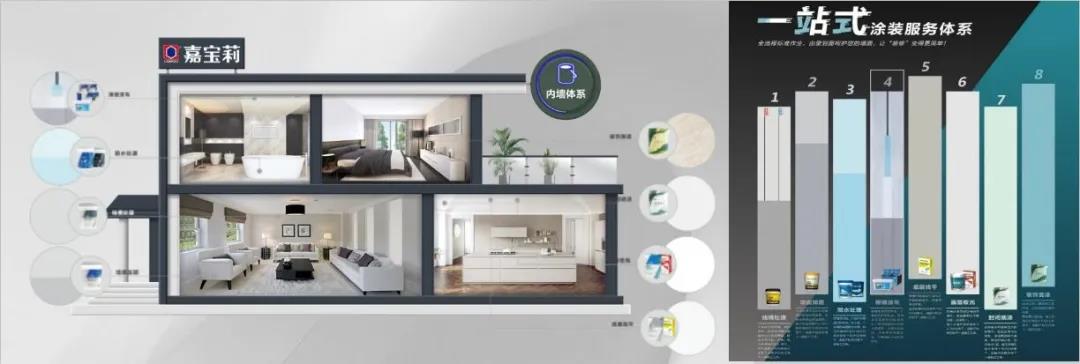 嘉宝莉聚焦新生代消费需求,用创新方式将涂料产品与设计、产品与服务完美融合,提出了2020年全新战略,全屋一站式涂装解决方案。由外及里,从底到面,产品全覆盖,标准化服务体系解决家庭涂装问题。