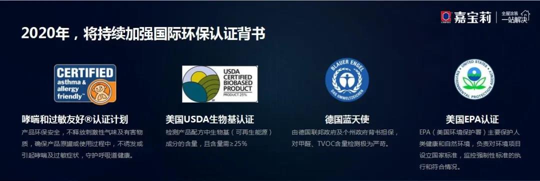 产品创新是企业谋求竞争与发展原动力,是企业整体营销破局的基础,2020年,嘉宝莉还将持续加强国际环保认证背书,如哮喘和过敏友好®认证、美国USDA生物基认证、德国蓝天使认证等。