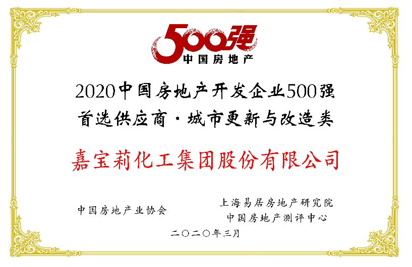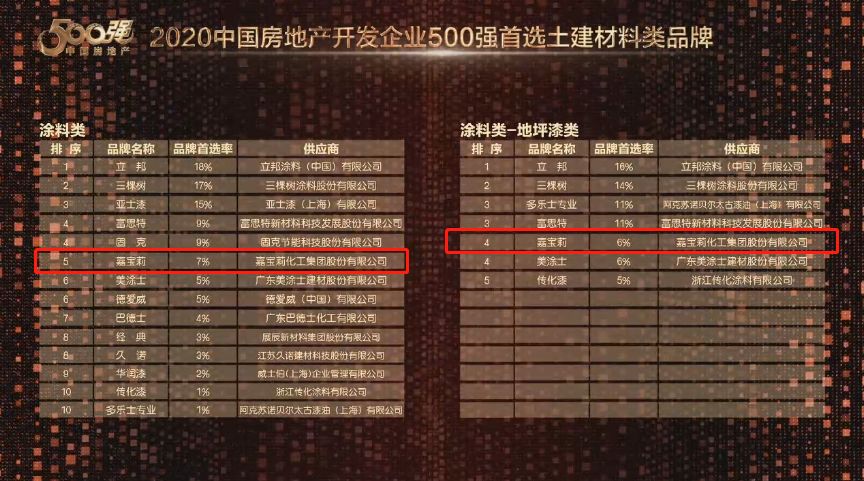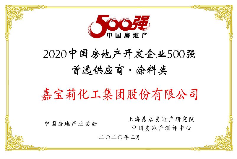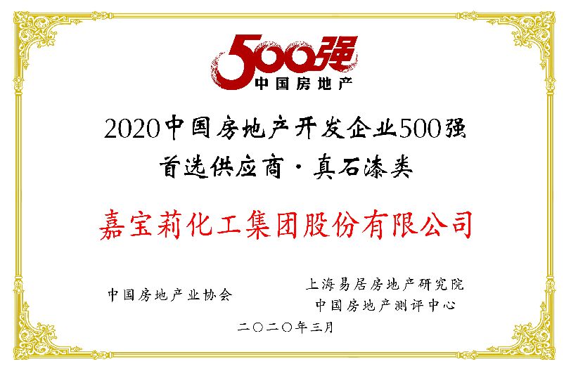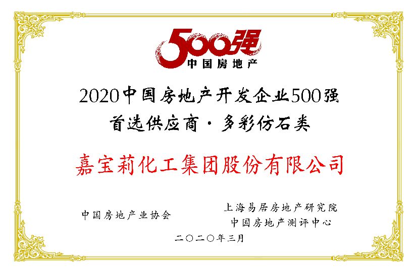 2020年,嘉宝莉化工集团股份有限公司凭借综合实力再次登上 “中国房地产开发企业500强首选供应商·涂料类” 十强榜单,其中真石漆、多彩仿石、城市更新与改造、地坪漆等产品体系更是以出色的产品质量、良好的业界口碑获得了首选产品子目录。