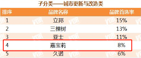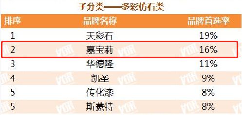值得关注的是,近年来嘉宝莉大建涂主推的明星产品“真石漆”和“多彩仿石”产品同时入围子分类榜单,分别位居第4位、第2位,这也是嘉宝莉真石漆产品首次冲进榜单5强,突围而出。此外,在子分类榜单中,嘉宝莉在地坪漆类、城市更新与改造类品牌中均排在第4位。
