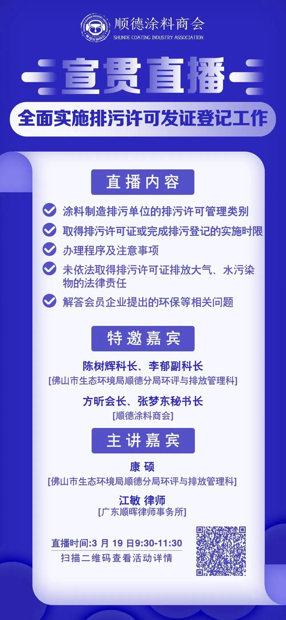 3月19日,佛山市顺德涂料商会联合佛山市生态环境局顺德分局主办的“全面实施排污许可发证登记工作宣贯会”,以线上直播的方式成功举行。