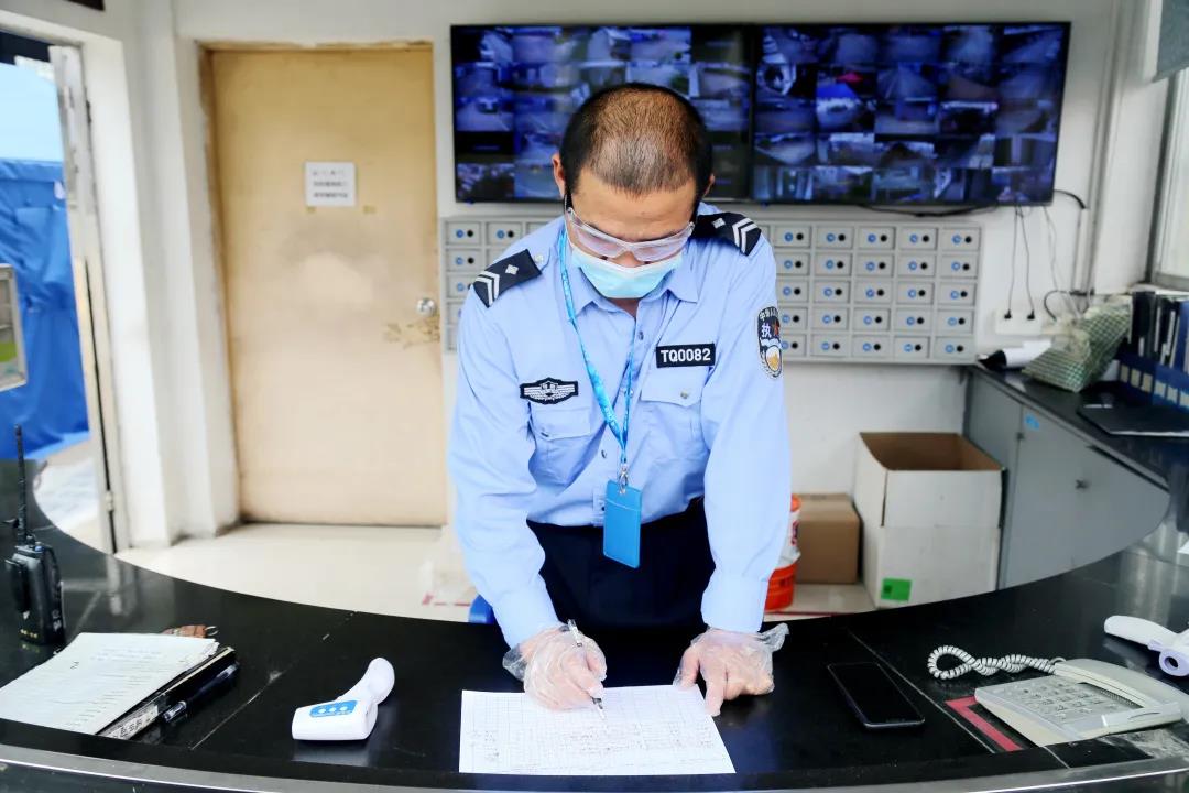 “现在是非常时期,防疫工作人人有责。能为这个大家庭做一点事,能为疫情贡献一点力量,我们都觉得很有意义。”门岗保安一边记录,一边说到。他们每天的工作细小入微,但却井然有序,严格做好出入车辆检查、人员登记、测量体温,守好嘉园的第一道防线。
