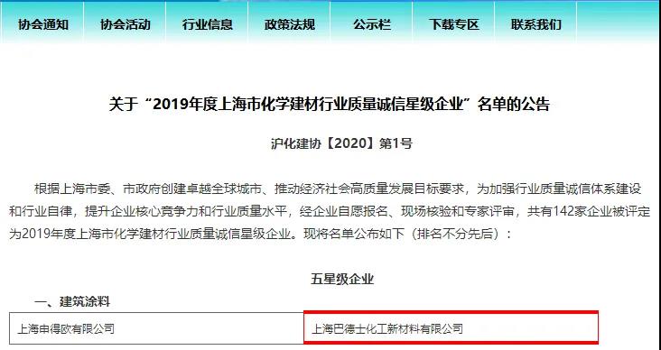 日前,上海市化学建材行业协会公布了“2019年度上海市化学建材行业质量诚信星级企业”名单,经过现场核验和专家评审,上海巴德士化工新材料有限公司被评定为“2019年度上海市化学建材行业质量诚信五星级企业”,对“品质巴德士”给出了最高度的认可!